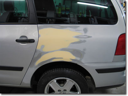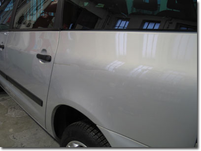 Das Blech wird so weit wie möglich zurück gedrückt. Sollte die Beule zu